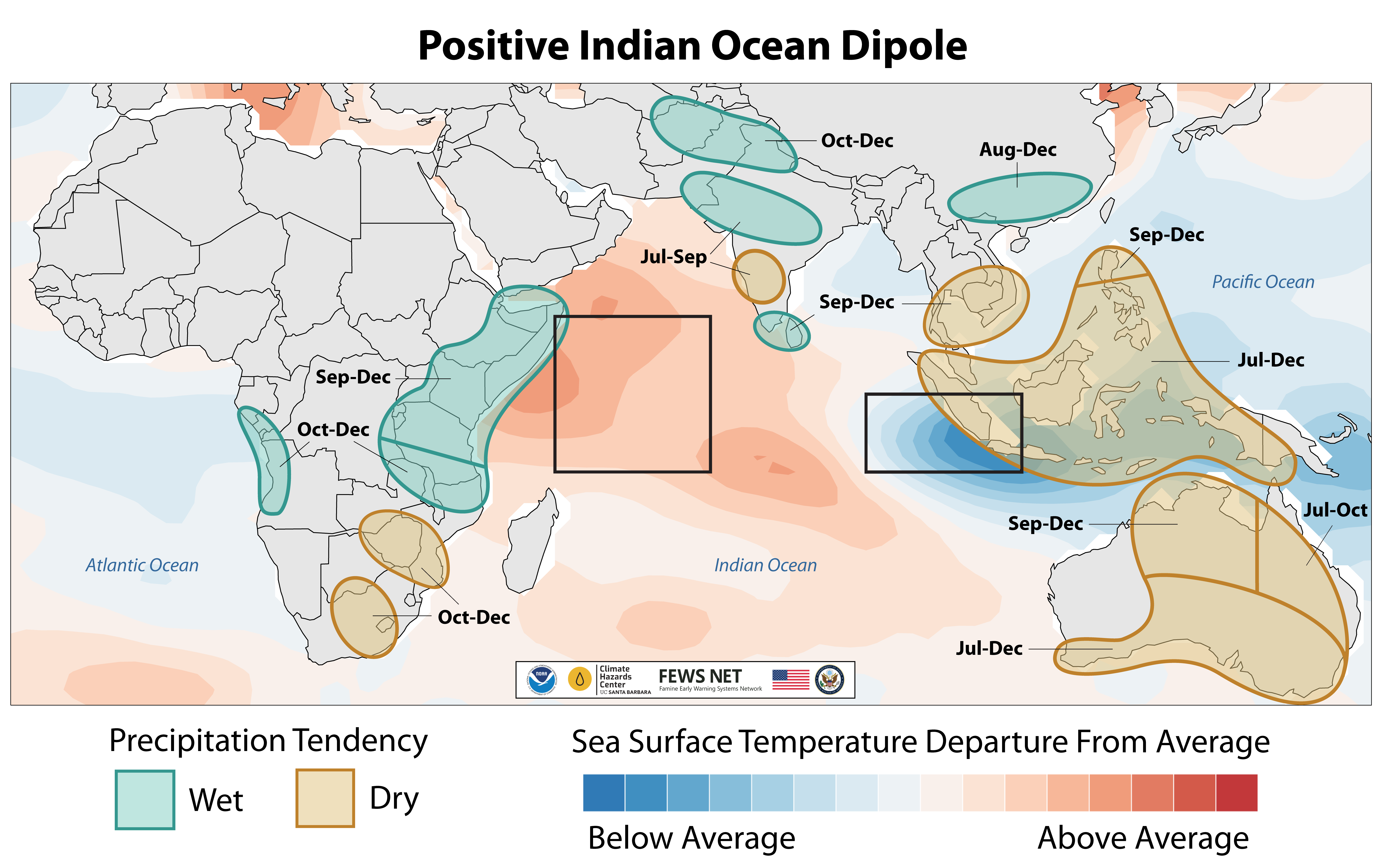 This page features Famine Early Warning Systems Network (FEWS NET) fact sheets and maps that show typical precipitation outcomes during both phases of the El Niño-Southern Oscillation (El Niño and La Niña) and the Indian Ocean Dipole.